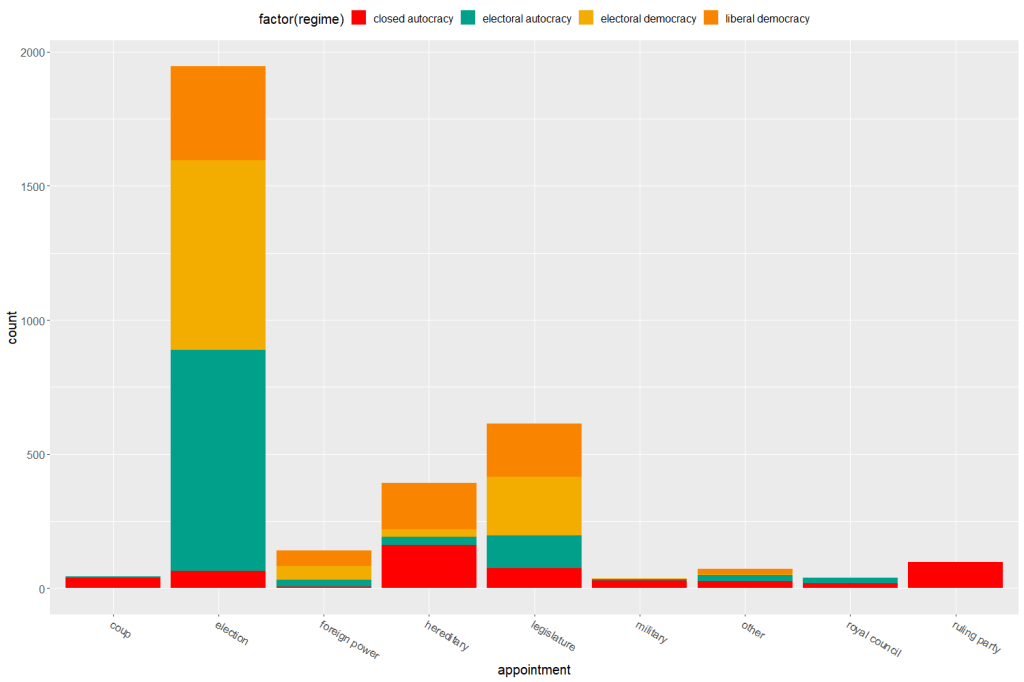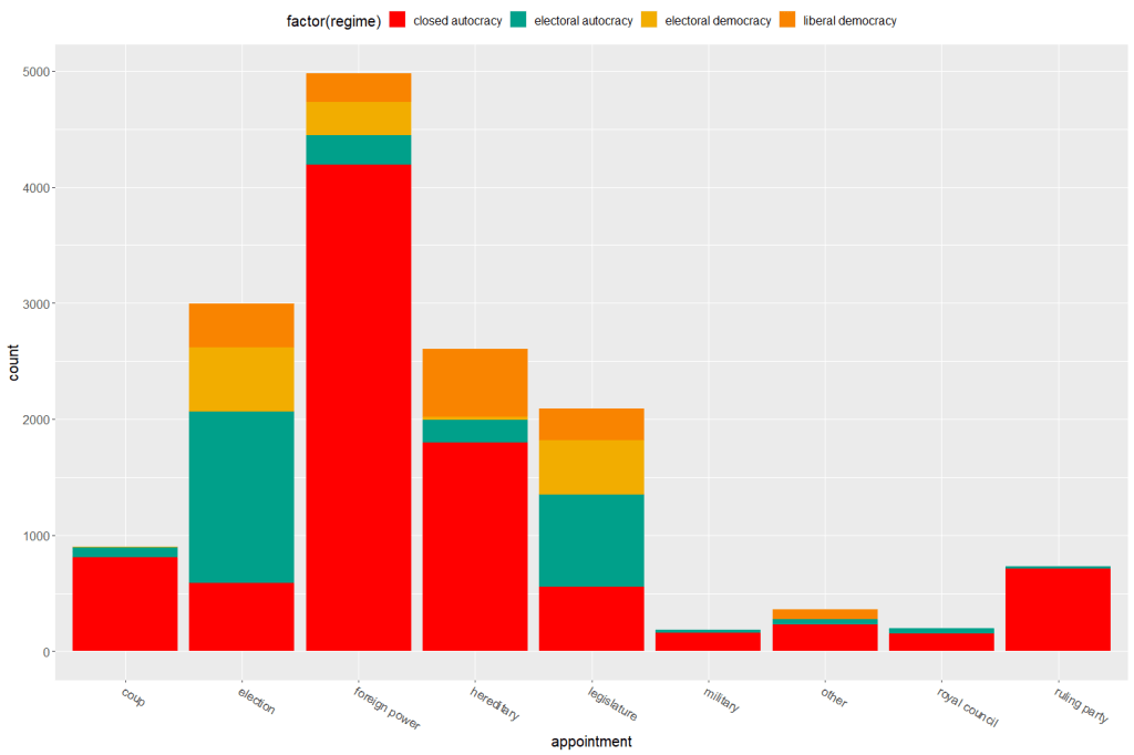 The graphs break down this relationship across four different regime types, ranging from the most autocratic in the top left hand side to the most democratic in the bottom right. There is more variety in this relationship with closed autocracies (i.e. the red points), with some points deviating far from the line.