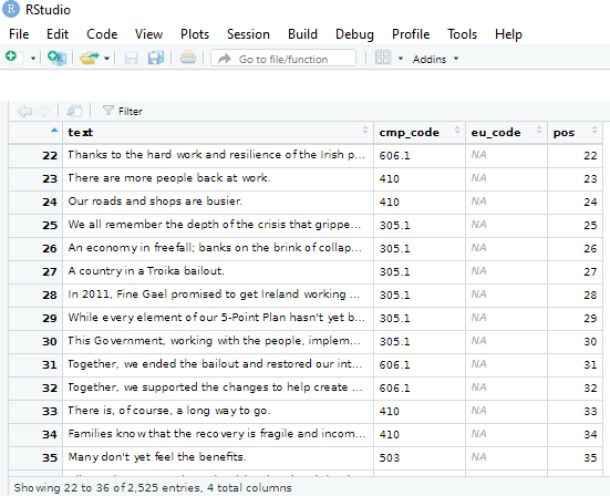 Then use the countrycode() function. First type in the brackets the name of the original variable that contains the list of countries in the dataset. Then finally add "country.name", "cown". This turns the word name for each country into the numeric COW code.