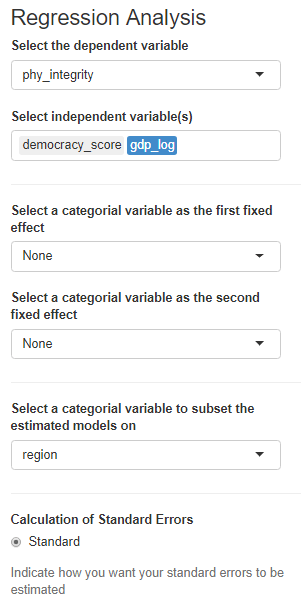 For example, I can use the ggplot2 package to graphically examine the relationship between civil society strength and freedom of citizens from torture. Also I can see whether this relationship is the same across regime types.