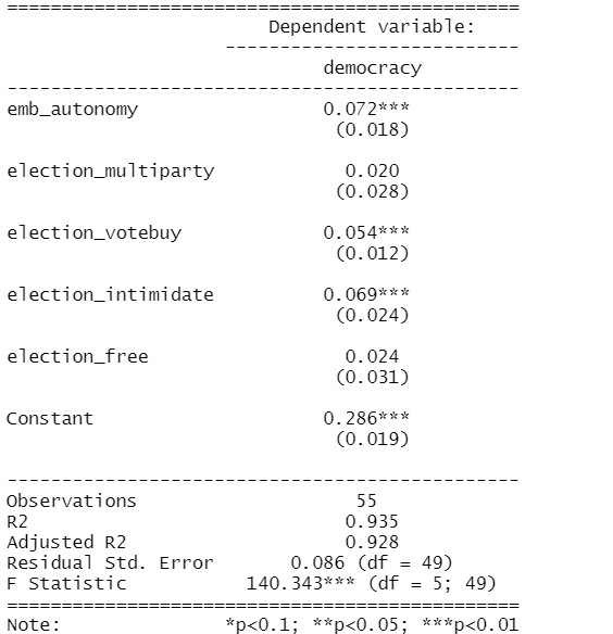 emb_autonomy – the extent to which the election management body of the country has autonomy from the government to apply election laws and administrative rules impartially in national elections.