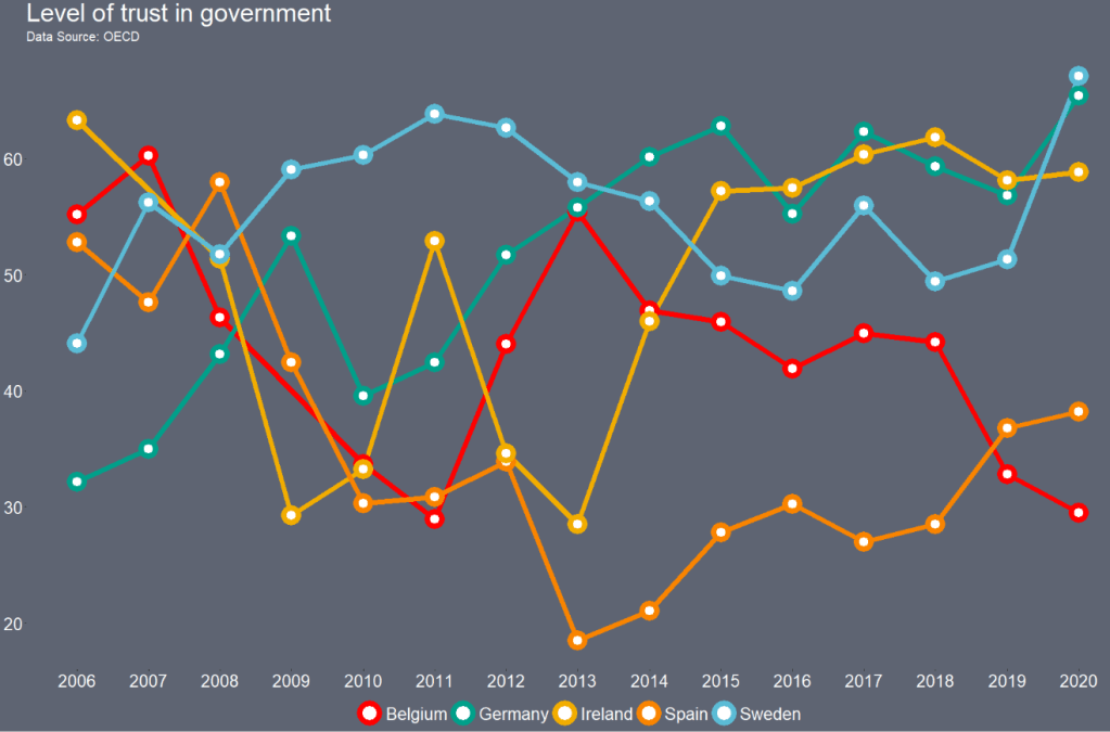 The last line is the geom_text() function that I use to specify that I want to label each observation (i.e. each OECD country) with its name, rather than the default dataset number.