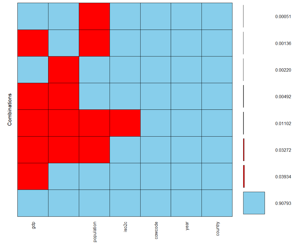 We with the aggr() function from the VIM package to look at the prevalence of NA values. It’s always good to keep an eye on this and catch badly merged or badly specified datasets!